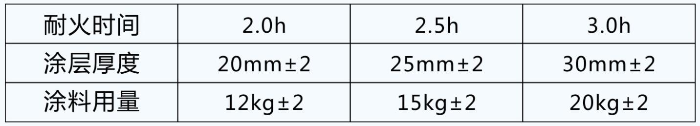 五、耐火時(shí)間和涂層厚度及涂料用量參考下表: